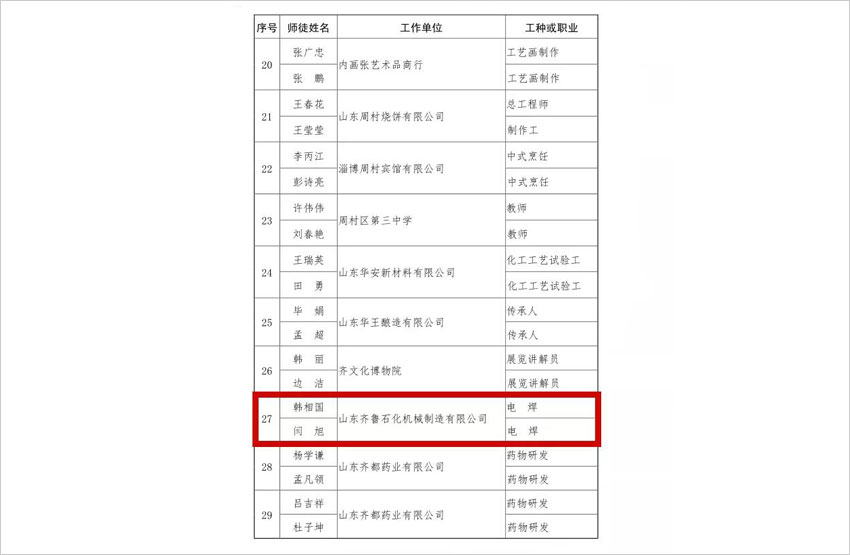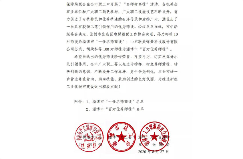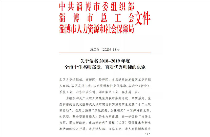 近日,中共淄博市委组织部、淄博市总工会、淄博市人力资源和社会保障局联合发文,命名表彰2018-2019年度“全市十佳名师高徒”、“百对优秀师徒“。